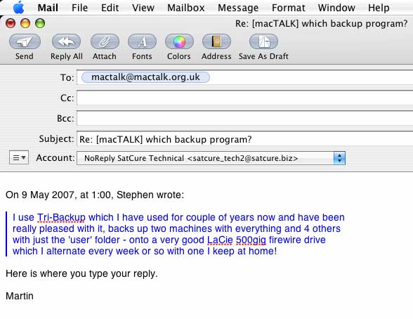 Notice that the quoted text has turned blue and has a blue line running down the side. You can cause this to happen manually by highlighting the paragraph in your reply and pressing [cmd] [ ' ]. To reverse this, press [alt] [cmd] [ ' ].