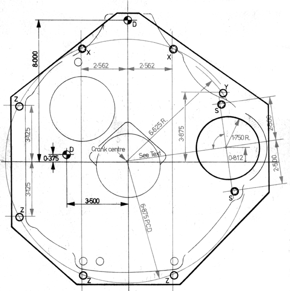 | | Fitting an MGB-GT gearbox to an Austin A40 (or similar) There is nothing all that unusual about an Austin A40 fitted with a 1275 engine, not even a tuned one. And Martin Pickering is probably not the very first person to fit a Ford rear axle to a BMC car in search of stronger half-shafts. Sprite front discs and a servo aren't going to blow anyone's mind. But an A-series engine fitted with a MGB all-synchro gearbox - now that's beginning to sound interesting. Why you may ask, would anyone went to fit a 'B' box to an A-series engine? Well, it is a lot stronger then even the Spridget item; from 1970 onwards it has synchromesh on all four forward gears and, best of all, it is available with overdrive. This whole business of fitting nonstandard gearboxes to engines not designed for them is well worth investigating, and, if nothing else, the story of how Martin did his conversion gives a very good idea of what is involved in such an undertaking. The box was the later all-synchro type which is also a lot stronger. |  | MGB-GT gearbox (non-overdrive). The overdrive version is slightly longer. | FACILITIES First and foremost, you are going to need a lot of elbow grease, if you want to keep expenses to a minimum. Even so, there is a number of jobs which will have to be done in a machine shop and, if you do not have free access to one, you will have to pay an engineer to do the jobs for you. This should not be too expensive if you provide him with all the information in this article. ADAPTOR PLATE This is the heart of the conversion. You will need 3/8" mild steel plate, of a minimum size of 13.75 " square. Accurate alignment is vital and the crucial dimensions are all shown in the drawing. The very light black lines show the outline of the original A-series backplate and this is used as a jig to drill & cut all the holes relating to the A-series block and also for locating the crank centre line (which is NOT necessarily concentric with the centre of the semi-circle in the hole in the middle). The position of said crank centre is found by its distance from the two plate-to-block dowel holes as shown marked 'D'. The old plate is used as a jig to drill and then ream these holes into a new plate and then the old plate is dowelled to the new one. It can then be used as a jig to drill all the plate-to-block bolt holes into the new plate and also to mark out the size and shape of the oil-pump and main bearing housing holes - these two holes varying slightly according to the exact engine. The position of the starter motor hole depends on the flywheel. |  | From the crank centre, which has been located relative to dowel holes 'D', the positions of the gearbox fixing holes can be marked out. All except hole 'Y' are on a circle of radius 6.875" from the crank centre. Those marked 'Z' should be drilled to 3/8" with a generous clearance, likewise 'Y', whilst the two holes 'X' are tapped to 5/16" UNC to take a pair of rocker box studs, as there is no room for bolt heads between block and plate. Similarly, starter motor holes (which are 5-inches apart) are tapped 3/8" UNF so the locating bolts screw directly into the plate. This is because the holes fall within the bounds of the bellhousing. | |  | The heavy black line in the sketch represents the approximate shape that the plate should end up at, though the photo (left) shows an 'optional' extra lump to fully blank off the starter motor hole in the bellhousing. Large holes for starter, oil pump and centre could be cut out by a man with a cutting torch and filed smooth to finish, or drilled all round the outline, chiselled out, and again filed to finish. All dimensions should have been marked out carefully before any cutting is undertaken. The finished plate may need cropping in some spots to clear things like exhausts, bodywork, steering etc. again depending on the exact car its all fitted to. | FLYWHEEL This is where things get quite tricky. When the conversion was first done, it was on a 948 engine, with a 1098 flywheel and clutch cover. (The radius, from the crank centre, of the centre of the starter hole is thus 5.6875 inches.) A special clutch plate was obtained from Automotive Products, of 7.25 -inch diameter as per A40, but with 1-inch-diameter/23-splines centre to suit the MGB input shaft. This is part number CP2257-9, and 7.25-inch diameter should be specified. An alternative, if you hire AP's drilling jig, is to drill for the different dowel positions to fit a special AP 7.5-inch diaphragm clutch cover and 7.5-inch version of aforementioned plate. The diaphragm cover is part no. CP2257-5. When the 1275 engine was fitted (which came from a Spridget, not Marina), extra bolt holes were drilled onto the 1098 flywheel to fit it to the 1275 engine. This is necessary as the smaller engines have 4-bolt flywheel attachment, 1275s are six-bolt. All was not well with this set-up: the clutch kept breaking because the original adaptor plate was not properly aligned. The final solution was to make up the plate as shown in the diagram, and use a 1.3 Marina flywheel. Strangely enough, although this flywheel has the advantage that a standard MGB clutch assembly goes straight on, it has the disadvantage that it does not go straight onto the 1275 Sprite crank. This is because the Marina 1.3 engine has a larger crank flange than the 1275 Spridget engine and it has only one dowel: the Sprite has two dowels, one of which is offset. |  | What Martin did was to remove the offset dowel from the Sprite crank. The flywheel was then bolted up and centred by turning the crank on Vee-blocks and using a dial gauge to check on run-out, Once this was as good as it could be, he drilled through flywheel and crank and reamed out to 3/8" to take a new locating dowel. A more satisfactory alternative, if you have the crank out of the car, is to have a machine-shop sleeve down the recess in the Marina flywheel to be a perfect fit on the Sprite crank. The offset dowel would still have to 