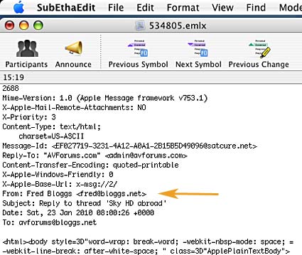 Right-click and open it in SubEthaEdit. You can now change absolutely anything, including the "From" email address. Save it.