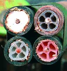 These are negative logarithmic ratios and -80 represents a miniscule amount of signal leakage compared with -29. Although the signal source and the measuring instruments were 5m apart, I think that the results for cable types A and B were compromised slightly by direct transmission from source to instrument. This is likely to happen with a ratio of 80dB. Slight movement of the connectors caused a fluctuation of a few dB. So, for this reason, the figures for cable types A and B are probably slightly worse than they would be in practice. The crosstalk with cable types C and D was much more 'solid'. I repeated the experiment, this time with all the cables reduced to 20m. The results were virtually unaltered. I also attempted an experiment using type A cable for transmission, but could get no meaningful results from cable types A, B or C. This strongly suggests that if the cables in an installation are all of type A or B, crosstalk will be unmeasurably small. Cable type C's performance is perfectly adequate. But look at type D, returning -29dB! Remember that analogue video needs a signal-to-noise ratio of at least 46dB. This simple test confirmed what a lot of installers have always suspected. Many and varied are the interference problems that can be cured by replacing cheap coax or flyleads with CT100 (Ed: WF100) cable. Satellite IF leaking into a UHF feeder, computer noise entering the flylead of an adjacent TV set, maintained lighting chargers putting white lines across all the TV screens in the building - the list is endless. Downleads inevitably pass alongside or at least near mains cables so, given digital terrestrial TV's susceptibility to impulse interference, type D cable is simply not suitable. Cable deteriorationCoaxial cables deteriorate with age, mainly because of the gradual ingress of moisture. Visible evidence is presented by a yellowing of the dielectric and dark discoloration of the copper. Even when these signs are not present, the performance of a cable may fall off severely over a period of years. Type D cables seem to suffer most, probably because the outer sheath is more permeable and there's no foil screen to act as a moisture barrier. TV distribution systems often share ducts and voids with district heating schemes and other plumbing: in such a humid, damp environment type D cables will become astronomically lossy after a few years. The signal losses are much worse at higher frequencies so, if you are quoting for the conversion of a system from Group A analogue to wideband digital, beware! In my opinion type D cable should not be installed behind the plaster in a new building. I suspect that it picks up moisture as the building dries out, because deterioration seems to set in very quickly. This can become a serious problem early in the life of a building. The way technology changes nowadays, it seems very short-sighted to use anything less than CT100 cable [Ed: now obsolete - use WF100]. The cost difference is, after all, at most only a few pounds, and who knows what signals and frequencies these cables will be expected to carry during their lifetime? For example, the Johanssen Stacker/Destacker system uses frequencies up to 3.4 GHz ! Kinks and bendsThe characteristic impedance of coaxial cable depends partly on the ratio between the diameter of the inner conductor and that of the screen. When a cable is forced into a tight bend this ratio changes and an impedance 'bump' is created. This isn't the place to go into cable impedance, standing waves and what have you but, take my word for it, impedance bumps are a Bad Thing! The minimum acceptable bend radius is usually regarded as being about ten times the cable diameter, whatever the cable type. The performance of coaxial cable will suffer if it has been ill-treated during installation - by kinking, being forced into small bends, or crushing. I suppose I should have set up some sort of comparative test in which the different types of cable were (a) subjected to a pretty violent installation by disgruntled electricians on piece rates and (b) installed by placid electricians keen on transcendental meditation. But I didn't. Take it as read: if coaxial cable is squashed, kinked, twisted, scorched or stretched, its performance will suffer. (Read more about kinks HERE.) What happens if a cable is bent repeatedly? This can occur during a difficult installation, or during normal use over a long period. Type C cable, with its transparent plastic wrap and thin layer of conductive material, suffers badly. Tiny radial cracks appear in the conductive coating and, since the braid is very skimpy, impedance 'bumps' are likely. But I must stress that repeated flexing of any coaxial cable will cause damage. The copper foil in type A and B cable can crack and, of course, the inner core of all cables will eventually snap. Special flexible coaxial cables are available, with seven-strand inners, solid dielectric and a dense braid of fine wire. But they are expensive and 'lossy', and are thus only really suitable for short interconnecting leads. Crushing and trappingCable clips should be of the correct size, and cable ties should not be over-tightened. Cables can be trapped and squashed accidentally, especially on a building site. When planning cable routes, try to anticipate the actions of 'other trades'. Cables in lofts should not run where, for example, they may fall victim to plumbers' size-twelve boots. Clip them to the side of timber that will be walked on, not the top. If it seems likely that a cable run will be mistreated in this way, use type B: foam-dielectric cables are physically tougher than any of the semi-airspaced ones. Cables to avoidThe list is many and varied. One such cable has no braid, just a few strands of wire that run longitudinally, and some sort of shiny (and allegedly conductive) coating that's attached to the inside of the outer sheath. Apart from the obvious screening deficiency, it's difficult to make a convinc