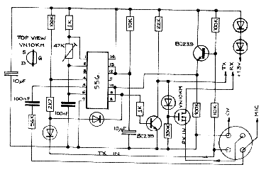 | | Roger Bleeps CB Circuits The first two circuits are very similar and use a 556 dual timer IC to produce both the bleep tone and the transmit delay function. The use of the trigger and reset pins together is an unusual feature which is used to remove the need for an extra transistor inversion stage. The use of the IC in this way has an unfortunate side effect of making it very critical of supply voltage, consequently you may need to alter the number of diodes on the 13v line in order to maintain the 556 supply at 11v to 12.5v or else fit a zener and resistor to stabilize the voltage.  The first circuit uses a miniature 12v relay for TX/RX switching, whilst the second version uses a bipolar transistor and Vmos FET combination. This version is slightly cheaper but has the drawback that on some rigs (notably Cybernet 134 board) the bleep will be heard through the speaker. Some people like that. Both versions require the TX input from the mic socket to go directly to the bleep circuit which provides a corresponding TX output for the rig. The RX input from the mic socket is not used in the relay version. In the second circuit the RX input is taken to the bleep board which provides an RX output to the rig. In both circuits the audio output from the bleep board is connected to the mic input wire on the socket. I think the diagrams make all this clear. To switch the bleep off, by the way, disconnect the 10uF delay capacitor.  The third circuit produces a train of up to nine bleeps (although if all nine are switched in only one long continuous tone will be heard). A 4017 decade counter is used as a shift register to enable each bleep. The presence or absence of each bleep (except the first) is determined by the position of the eight DIP switches S2 to S9. (S1 is permanently closed since it is assumed that at least one bleep will be required!) A "K" for instance could be programmed by setting S2 and S3 ON, S4 OFF, S5 ON, S6 OFF, S7,S8,S9 ON. to give - . - "da di da" Before you get too excited I must point out that this bleep was designed for a Yaesu transceiver with internal relay switching, which limits its application to rigs with relay switching, unless you add your own relay to it. IC2 is a quad two-input NOR IC which performs delay functions, gating functions and produces the bleep tone which is adjusted by VR3. VR2 determines the speed and VR1 the output (volume). A VN10KM Vmos FET is used to "pull" the TX line low during the bleep function. This circuit is susceptible to interference from high levels of RF radiation and should be suitably screened or kept away from the transmitter output. | |