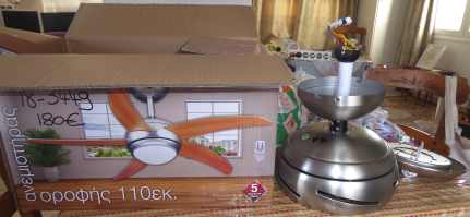 My wife wanted a ceiling fan in the bedroom so I told her to buy one and I'd fit it. So she spent 180 Euros on the heaviest unit she could find! The instructions stated that the ceiling must be capable of supporting 100 kg weight. That was a problem because our roof is made of reinforced concrete a foot thick and insulated inside with 32 mm expanded polystyrene sheet and plasterboard. I removed the mattress and placed the step ladders on the base, which is well supported by the steel frame beneath. Mains power turned OFF. I removed the lamp, which was suspended from a small hook that was screwed into a plastic plug in the concrete ceiling. I marked out a rectangle on the ceiling that needed to be cut away. An electric reciprocating/vibrating tool was used to cut away the plasterboard and blue insulating foam. Closer view of the resultant hole and the existing wiring - live, neutral and earth. Note: I had chosen the position of the rectangular hole so that the short wiring could be connected easily to the screw terminal strip on the support bracket (see below). I cut a piece of wood to fit and drilled two holes through it. With the wood firmly wedged in the hole. I used a drill to mark the hole positions on the concrete ceiling then removed the wood. It was a hot day and it required a lot of effort to balance on the step ladder and drill holes into the concrete. My wife thought that I was about to have a stroke. (The camera lies. I was definitely not as bilious in colour as the picture suggests!) With plastic plugs inserted into the holes in the concrete, I tightened two very long screws to hold the wood in place. I had already marked the wood and drilled four pilot holes for the screws that will hold the support bracket. (Two screws were supplied but I added two more, since there were four slotted holes in the bracket.) Support bracket screwed in place. It comes with a 3-way screw terminal strip and a wired plug that connects to the fan assembly. Note the "horseshoe" into which the ball of the fan assembly will be fitted. The remote control receiver unit is separate and I found the instructions confusing. It appeared that the infrared receiver "eye" was meant to be stuck to the ceiling with a self-adhesive pad but there was no slot in the metal cover for the thin cable to exit. However, there was a large, circular hole in the cover that seemed to be suitable for the "eye" to look through but the hole was slightly too small to allow the "eye" to fit. So I took the unit into my workshop. Rather than attempt to file the hole larger, I held the "eye" against it and used an old soldering iron tip to melt plastic adhesive around the eye to secure it in place. Now the fan assembly was ready to hang by inserting the ball end into the "horseshoe" of the support bracket. Here the remote control receiver unit is inserted into the gap provided above the "horseshoe". See the red "eye" protruding slightly from the metal cover, bottom right. Cables connected. See the "eye" glued inside. It still has a self-adhesive pad on the rear, with paper disc protector. There was no way to use this adhesive pad. The cover was pushed up onto two screws on the support bracket and twisted into the slots. Two additional screws were inserted into the holes provided and tightened. Now I had to remove the three screws from each blade bracket then reinsert and tighten them with the blade in place. Note to self: I need to expose my head to the sun more often. I'm beginning to look like an ice cream cone. Five blades fitted and 15 screws tightened. Lamp holder fitted with three screws and connected electrically. Bulb fitted and glass bowl screwed into place. Mains power turned on and the remote control works the lamp. And the fan works at various speeds selected by the remote control. Send this page address - CLICK HERE - to a friend ! Installing a Primo Ceiling Fan with Remote Control