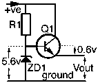 This method is OK for low currents but the resistor becomes too hot if larger currents are needed. To cope with this problem we can add the NPN transistor (Q1). Now the transistor passes the current required at the output.