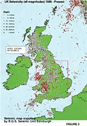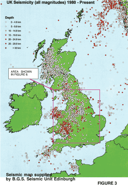 I gave much thought to the areas of interest in the seismic presentations from the B.G.S. maps. The "aseismic" areas depicted in them attracted my attention. The earthquakes occurring in clusters along and around the grabens and sink holes depicted in figures 2 and 6, lead me to suspect that lying deep in these fairly impermeable grabens or holes there are geothermal aquifers - Figure 5 section B.