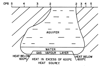 It is well to remember that water on the bottom of the hole can, because of the air pressure, exist at a temperature of many hundreds of degrees-up to the flash point pressure. This I observed in Mexicali Mexico, where water existed at 600šC. This water can be recovered as steam if encouraged to rise up to a lower pressure level. The technique has been used on several geothermal areas in the world. This process involved sealing the well head and blowing in compressed air, then knocking a sealing chock free, which is retaining the compressed air.This causes the water to follow the vacating air up the bore hole to where a lower pressure exists, where the steam is then produced.This is no problem in a fully cased bore hole. It is wise to put a small pipe down to the bottom of the bore hole, to provide a small amount of water, in case the need arises to quench the then producing well.
