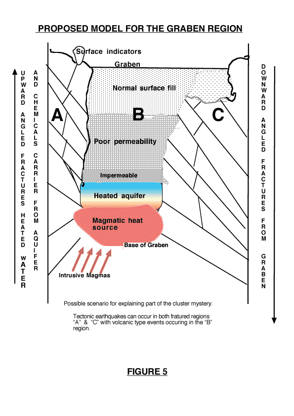 This type of deeper system (Fig 5) has a lot going for it; for example, it offers a better containment with a modicum of insulation and not too shallow to cause surface dangers. This theory does not require only an enclosed graben. It can occur in a large collapsed hole produced by removal of magmas to the surface, during an eruption, and the vacated area collapsing, as for a graben. These vacated areas often occur within the vicinity of surface volcanoes. These volcanoes themselves can be dormant on the surface, but contain magmas at depth, penetrating the area filled with loose material from erosion. These can be alongside zones of high seismicity. Tectonic earthquakes appear to be caused by large solid blocks of material colliding. However, it is important to realise that a graben area filled with sedimentary material cannot support a tectonic type earthquake, whereas volcanic shocks appear to be caused by magmas in bursts of tremor, (not the slippage of solid blocks), and usually only when encountering water and soft materials. Magmas can be traced and their flowing movement underground can even be plotted.