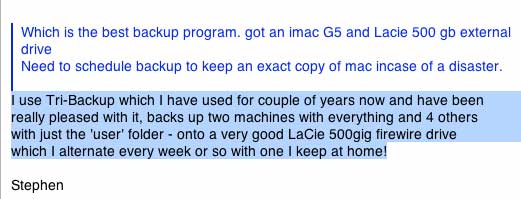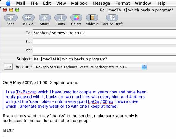 Notice that the quoted text has turned blue and has a blue line running down the side. You can cause this to happen manually by highlighting the paragraph in your reply and pressing [cmd] [ ' ]. To reverse this, press [alt] [cmd] [ ' ].