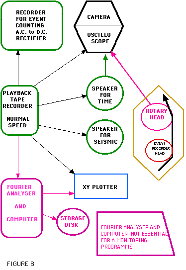 A slow motion tape recorder can be situated in an observatory (Fig 4), with the ongoing seismicity being recorded - especially if land lines are directly feeding into this observatory. A recorder can be modified to take a rotating magnetic head, which will scan the piece of tape that is in contact with the head. A certain amount of the tape can be allowed to wrap partly around the rotating head, so as to scan at least one half minute of real time of the seismic signal arriving at the recorder. This can be coupled to trigger the trace on an oscilloscope, so the rotating head gives a constant moving picture, just as a movie film appears to do. Wiper contacts from the head can be used to transmit the signal from the moving head to the oscilloscope. A wiper-contact can also be used to trigger the oscilloscope trace. This is the best way to handle the data leading up to an eruption, especially if you use multiple channels displaying all the seismometers, in the same time scale. In other words you can view the seismic events directly that are actually happening, with only a slight delay. This gives a hands-on approach to the progress of the eruption at all stages. Even if stations get cut off, the eruptive progress can still be monitored, giving on-the-spot predictions.