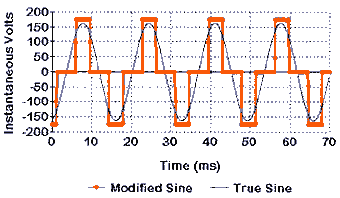 Modified sine-wave inverters are the least expensive type. They are usually very efficient, light, and compact and are available in models supplying less than 150 watts to others which can power equipment requiring several kilowatts. They work by imitating the waveform produced by 230V mains electricity but, as can be seen from the diagram below, the waveform they produce is far from smooth. The result is that some appliances won't run as smoothly, as efficiently or as quietly as they would normally. TVs usually show interference in the form of a thin line rolling up the screen; microwave ovens may take a lot longer to cook; battery chargers may overheat or make a buzzing sound; power tools may run roughly and some equipment may be damaged or just won't work at all. For most applications however, a modified sine-wave unit will do the job and the possible disadvantages are outweighed by the low cost of a modified sine-wave unit.