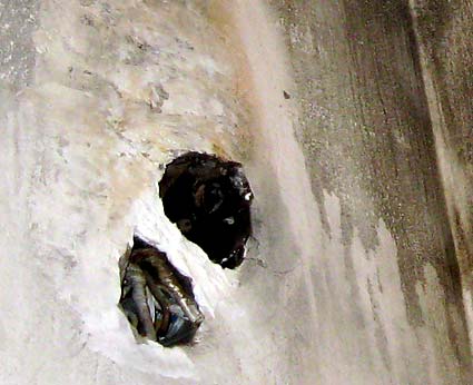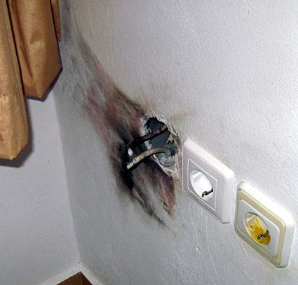 | When an electrical storm is imminent it is essential to disconnect all cables from telephone sockets and TV aerial sockets. It's also advisable to disconnect all plugs from mains 230v sockets and to disconnect satellite dish LNB feeds. In addition, move leads away from the sockets because lightning can jump huge gaps! You can install some protective measures in case you are not home when an electrical storm arrives. Buy a phone line surge protector*, which looks like a mains adapter. It must be plugged into the nearest mains power socket (for earthing). Connect a lead from the telephone socket to the surge protector. Connect a lead from the surge protector to your Wi-Fi router/modem. Connect your landline (static) phone to the router/modem. *Note: this type of surge protector, and also the type which is integral with a mains power socket strip, uses devices called "Voltage Dependent Resistors" (VDRs). These are designed to go short-circuit in the event of a surge. In the event of a minor surge they might not go short-circuit but they could be degraded, thus offering little or no protection thereafter. For this reason, if you know that there has been a surge associated with a lightning storm, you should replace the unit. (Alternatively, VDRs alone can be replaced if you are handy with a screwdriver and soldering iron.) (A well designed surge protector should not affect your broadband speed, provided that it is no more than 8 Mbps. If your speed is higher, then a surge protector will probably have a significant slowing effect.) Once a telephone line surge protector has experienced a surge it should be replaced or repaired because it will not be as effective the next time. You can also buy mains power strips which include a telephone line surge protector and some form of rudimentary mains surge protection. Electrical appliances should be connected to the mains power socket via an Automatic Voltage Regulator (AVR). The most common types are rated at 500 Watts and 1000 Watts. Choose one that is suitable for the appliance(s). You might be able to connect more than one item to a single AVR (check the power ratings). An AVR affords good protection against a high-voltage surge and also against a momentary "brownout" (reduced voltage). Connect anything that matters to an AVR. (It's a good idea to include your electric blanket!) A fridge/freezer needs an (AVR) with a timer function so that it doesn't switch off/on repeatedly, since that can destroy a motor. Do NOT connect a mains surge protector to an AVR output because it could short-circuit the output. Check with your supplier if you aren't sure. Uninterruptible Power Supply To allow time to shut down your computer and/or other equipment, you can install a UPS. This must be plugged into the AVR output. (I had a UPS that was plugged directly into the mains power socket and it was destroyed by a mains surge, together with some of the equipment connected to the UPS!) It's important to note that a UPS will NOT afford much (if any) protection against a mains voltage surge. Its only purpose is to maintain power long enough for safe disconnection of the equipment that it is powering, in the event of power failure. Even if it includes "surge protection", it will be no more effective than a "surge protected socket strip". And any such surge protection degrades with every surge. For better protection, connect an Automatic Voltage Regulator between the wall socket and the UPS. Lightning struck the TV aerial mast of a house not far from here (in a valley!) It blew the aerial mast off the wall, travelled down the coaxial cable into a linen cupboard and arced across from the TV aerial socket into the mains power socket ten centimetres below. (In doing so, it set fire to sheets in the cupboard - hence the smoke and heat damage to the walls). It travelled down the mains and aerial cables, blowing sockets off the walls and dislodging several ceiling lights before reaching the basement and damaging the electronic circuitry of the boiler. It also killed the TV, DVD player and audio Hi-Fi unit. (Curiously, the satellite dish on the roof was undamaged and the satellite receiver was also undamaged.) As you can see from the photo, they were very lucky that the curtain didn't go up in flames. Keep curtains and furnishings away from sockets and wiring. When the TV aerial was replaced, it was fitted to a long pole some distance from the house. The cable was run underground in suitable piping. You can reduce the risk of damage by looping external cables down to the ground, then up to enter the house. Lightning goes for the easiest path to ground, so some of the discharge will go to earth at the loop, thus reducing the power that enters the house. There will still be damage but it will be less than would occur if the full power of the strike entered the house. You might further reduce the damage by running your aerial or satellite cable through an earthing bar at the bottom of the loop (or before it enters the house if you can't provide a loop at ground level). A loop at ground level must be protected against rodents. (Exposed cable should also be painted to protect it against UV in sunlight.) To install the earthing rod, dig a hole in the ground, place the rod into it, then back fill with moist soil, tamping down firmly as you fill. The earthing bar is connected by a stout cable* to an earthing rod, which is buried in the ground. This provides an easier path to ground, making it less likely that a large amount of energy will enter the house. Whatever you use is likely to vaporise very quickly in a strike! However, that doesn't matter if the distance is short (and it must be) because the ionised air will continue to carry the current for the microseconds duration of the lightning strike. Obviously, it doesn't have to be insulated (but insulation might give it some protection from corrosion). You could use multistrand copper cable but anything thick enough will be very exp